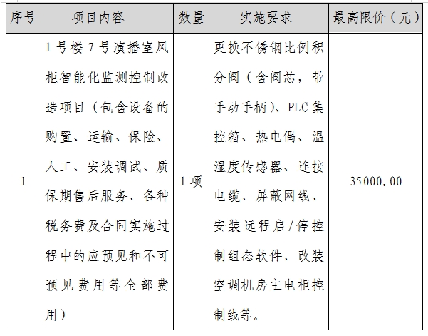 1、標的名稱:1號樓7號演播室風柜智能化監(jiān)測控制改造項目