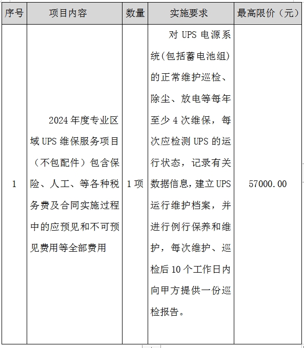 項目名稱:2024年度專業(yè)區(qū)域UPS維保服務(wù)項目(不包配件)
