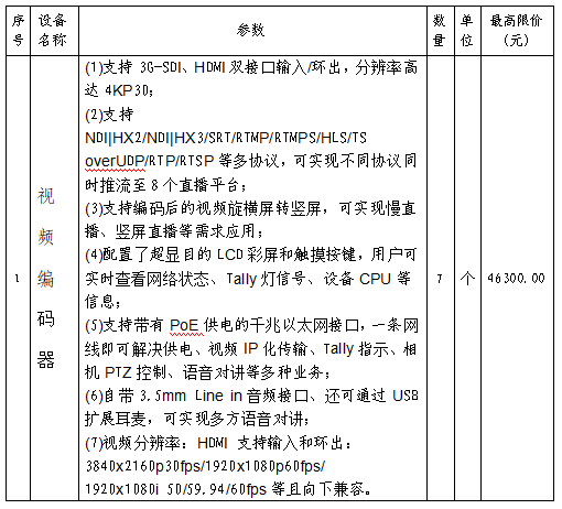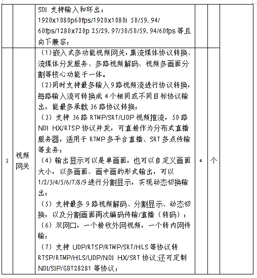 采購(gòu)需求:采購(gòu)7個(gè)視頻編碼器和4個(gè)視頻網(wǎng)關(guān),具體型號(hào)和參數(shù)如下表:
