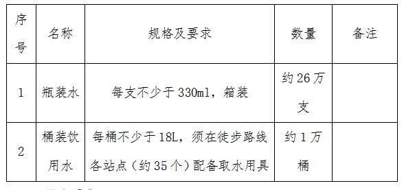 1、主要內(nèi)容:合作供應商負責在徒步當天為佛山五區(qū)報名參與徒步的市民及相關工作人員提供飲用水服務,詳細需求如下(以下數(shù)據(jù)供參考):