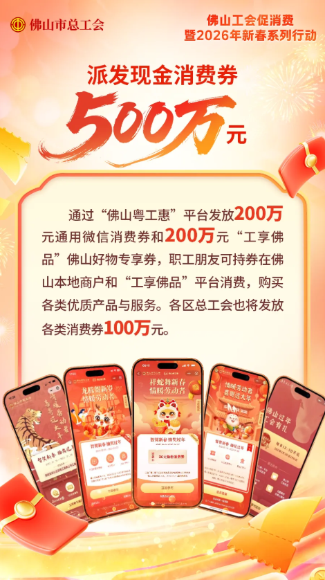 今年春節(jié),市總工會聯(lián)合區(qū)級工會計劃投放總額逾500萬元的消費福利組合,包括發(fā)放200萬元“工享佛品”專區(qū)消費券,200萬元新春消費券以及各區(qū)總工會發(fā)放超100萬元消費券,充分釋放職工消費活力。目前“工享佛品”專區(qū)消費券火熱派發(fā)中。